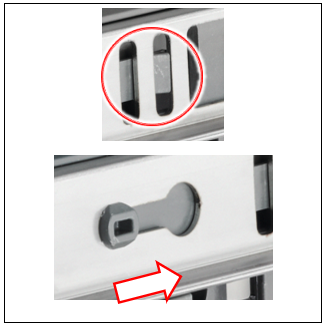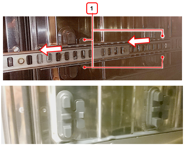 1 - Натиснете четирите щраквания и плъзнете релсата по посока към предната част на съдомиялната машина. Това движение трябва да е достатъчно малко, само за да освободи релсите от ваната