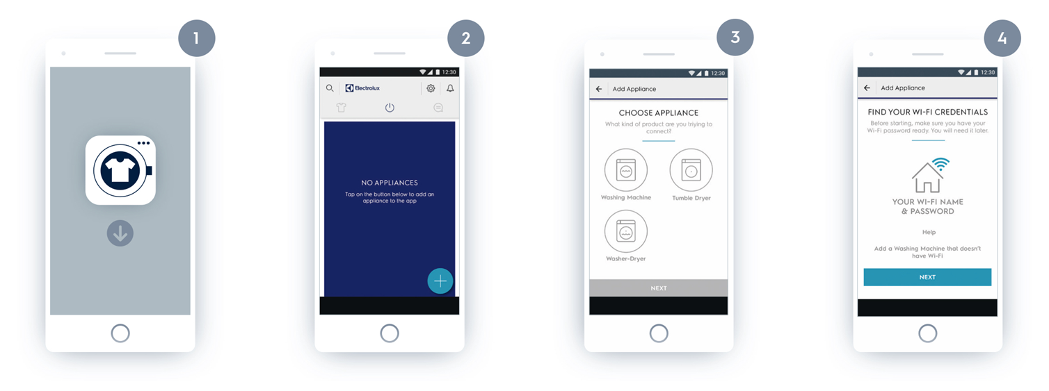 1. Стартирайте приложението My Electrolux Care. Изберете държава и език. Създай профил. Отворете раздел Уреди. (Разделът "Уреди" е в горното меню (Android) или в менюто долу (iOS.))
